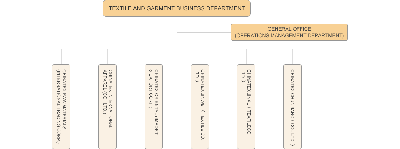 The Textile and Garment Business Department consists of 8 subsidiary enterprises including Chinatex Raw Materials International Trading Corporation (Chinatex Raw Materials), Chinatex International Apparel Co., Ltd. (Chinatex International), Chinatex Oriental Trading Corporation (Chinatex Oriental), Chinatex Knitwear Trading Co., Ltd. (Chinatex Knitwear), Zhucheng Chinatex G-Way Textiles Co., Ltd. (Chinatex G-Way), Zhucheng Chinatex Sunrise Textiles Co., Ltd. (Chinatex Sunrise), Zhejiang Chunjiang Light & Textile Industry Group Co., Ltd. (Chinatex Chunjiang).
